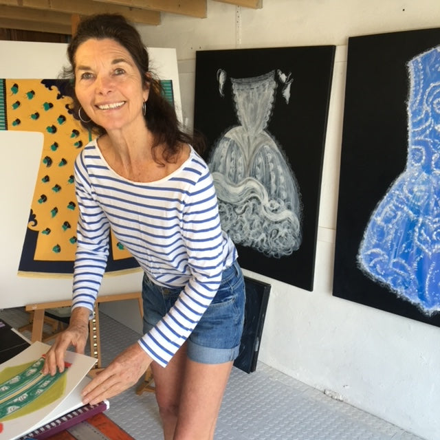 The inspiration for Anna's prints comes from various art trips to Japan, Cambodia, Brazil and costume. She also paints large colourful Kimono on canvas to commission and has also exhibited with Art For Cure on several occasions.